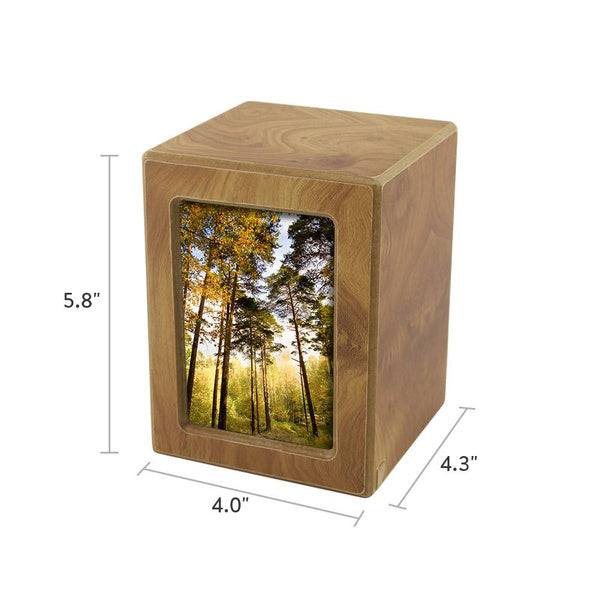 Forever cherish your beloved pet with a cremation urn from our Photo Box collection. This extra small urn is made from medium-density fiberboard and has a natural woodgrain-like finish. Features a photo slot separate from the cremation compartment, which holds a 3.25 in x 4.75 in photo. Enhance with custom engraving. Includes bag with a tie with a sliding bottom secured with a screw.