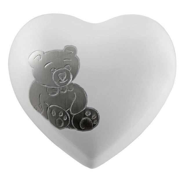 - This brass heart urn features a glossy pearl finish with a pewter teddy bear.